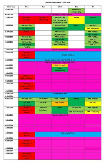 The training programme aims to fully equip trainees with a wide range of skills necessary for the role. This includes training in all curriculum areas and additional training on: safeguarding, SEND, EAL, Children Looked After, writing PSP’s, memory training and behaviour management. All training is evaluated by trainees and the training programme is reviewed annually using results from this feedback.
