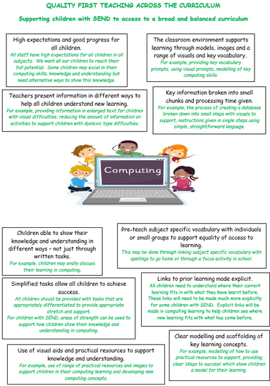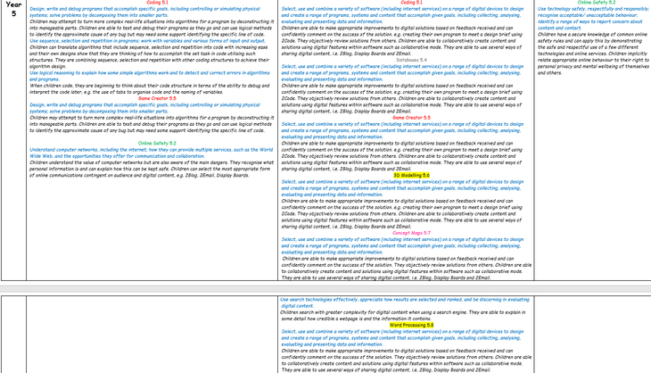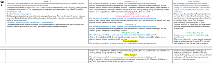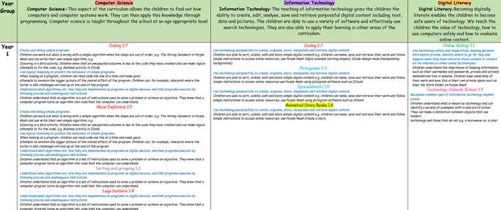 Our curriculum is driven through the following computing aspects (Information Technology, Digital Literacy and Computer science) which are explored in a wide breadth of topics. Our curriculum is arranged so that pupils return to these same aspects repeatedly, gradually building an understanding of them. Our Long term plan details how pupils will be given opportunities to relate topics to previously studied topics to deepen understanding.