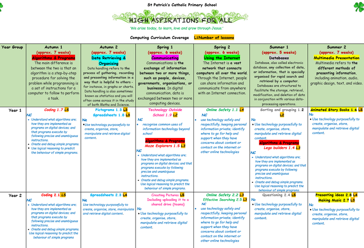The curriculum at Saint Patrick's is organised into six topics per year group. The topics are grouped into computing skill strands taken from the National Curriculum (Algorithms & Programmes, data Retrieving & organisation, Communicating, using the Internet, Databases and Multimedia Presentation) a strand will be taught across the school at the same time enabling knowledge, skills and resources to be shared and developed as well as monitoring and assessment of the subject to be undertaken.