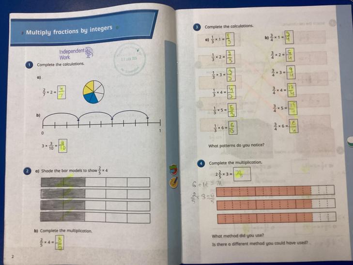 • Multiply proper fractions and mixed numbers by whole numbers, supported by materials and diagrams.
