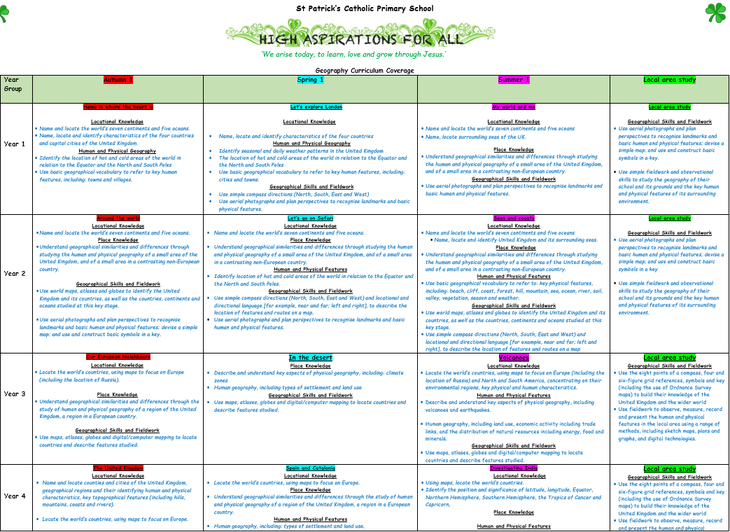 At Saint Patrick’s, we believe, the welcoming and respectful environment which is enriched in catholic morals and teachings, continues to enhance the educational and pastoral experience of every individual passing through our doors. Our teachings are underpinned by the ambition of ensuring that our children are able to reach their full potential and succeed as well-rounded individuals within the community. We recognise that each child is unique and as such are supported in reaching their full potential. The teaching and learning environment at Saint Patrick’s is underpinned by the foundation of our supportive ethos and varied approaches to learning, all of which contribute to developing the children as both collaborative and independent learners. The impact of our Geography curriculum is measured in the experiences, confidence and competence of our children within the subject. We ensure children receive the experiences they require, both within and beyond the curriculum, to develop their skills and knowledge and become confident geographers.