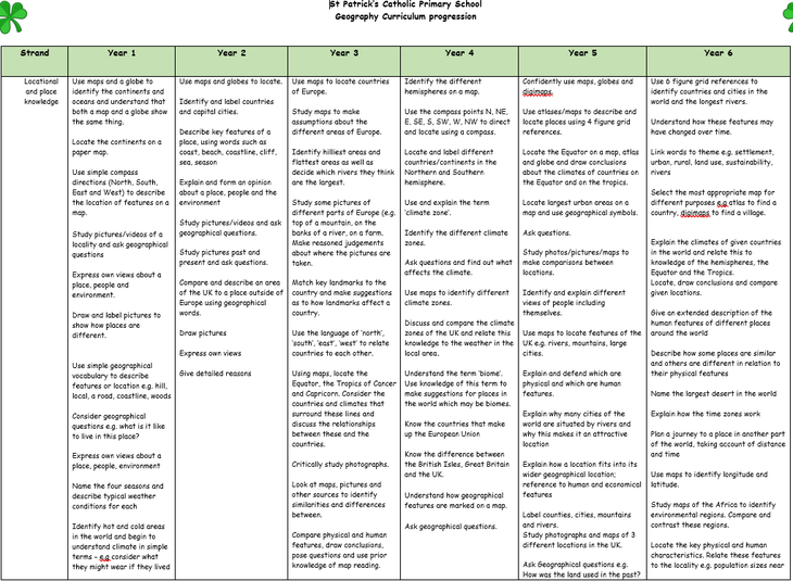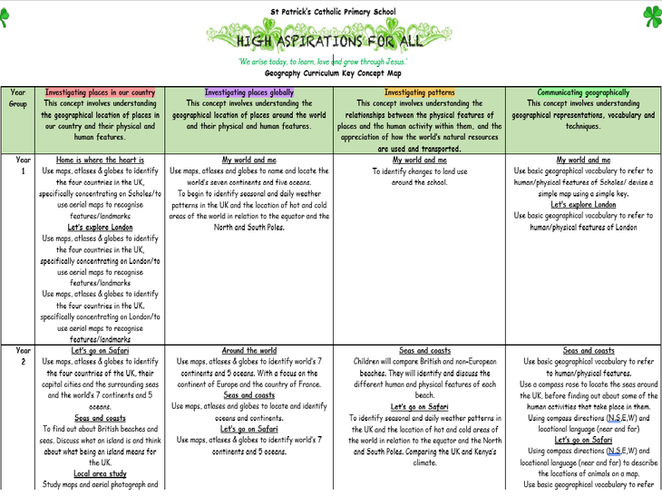The geography curriculum at Saint Patrick’s is organised into four topics per year group which are driven by our key concepts in geography: investigating places in our country, investigating places globally investigating patterns and communicating geographically. Our curriculum is designed with the aims of instilling a love for geography as well as developing knowledge of the world and their place within it. Our curriculum arranged so that pupils return to these same concepts repeatedly in within and across a wide breadth of topics, gradually building on their understanding of them. As such, we aim to ensure that we have developed contextual knowledge of the location of globally significant places as well as deepen an understanding of the processes that give rise to key human and physical features and how they might change over time. Our long-term plan details how pupils will be given opportunities to relate topics to previously studied topics to deepen understanding.