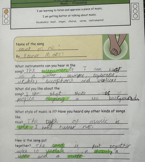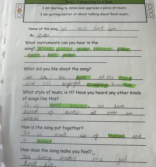 To talk about the musical dimensions working together in the songs, using accurate musical vocabulary.