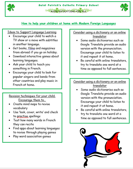 Children begin to develop their knowledge of French at Year 3 and continue this throughout their Key Stage 2 journey. They are taught weekly with school theme days throughout the course of our academic year. Through the use of Language Angels scheme of work and resources, we at Saint Patrick’s ensure we offer a relevant, broad, vibrant and ambitious foreign languages curriculum that will inspire and excite our pupils using a wide variety of topics and themes.