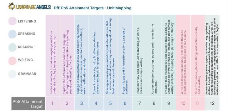 The Progression Map shows precisely how pupil foreign language learning across the key skills of speaking, listening, reading, writing and grammar progresses within each Language Angels ‘Teaching Type’ and also how the level of learning and progression of each pupil is increased as pupils move across each subsequently more challenging Language Angels ‘Teaching Type’. It is a visual demonstration of the progression that takes place WITHIN a ‘Teaching Type’ and also ACROSS each ‘Teaching Type’.