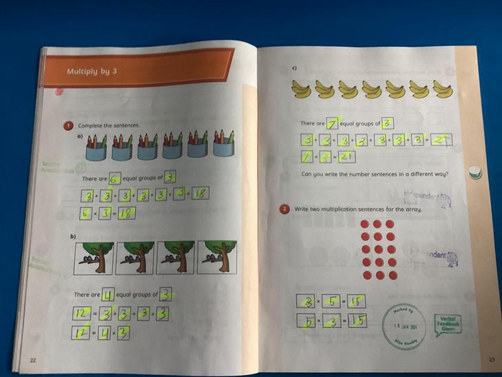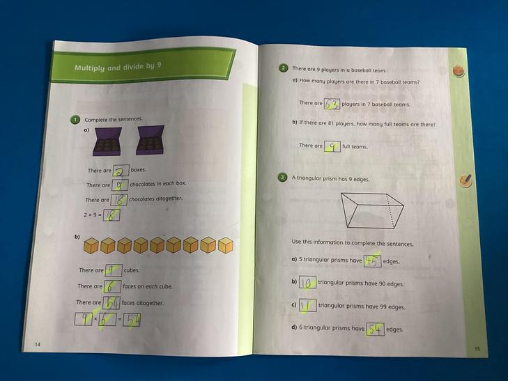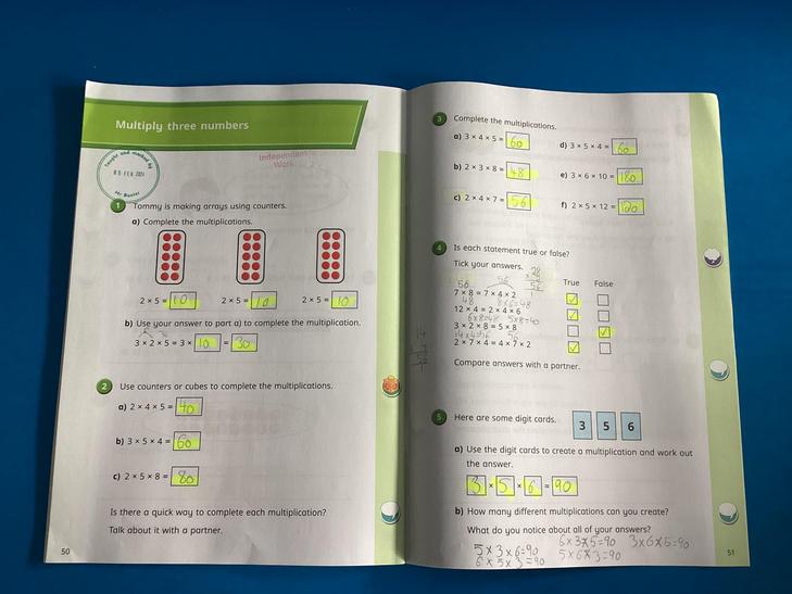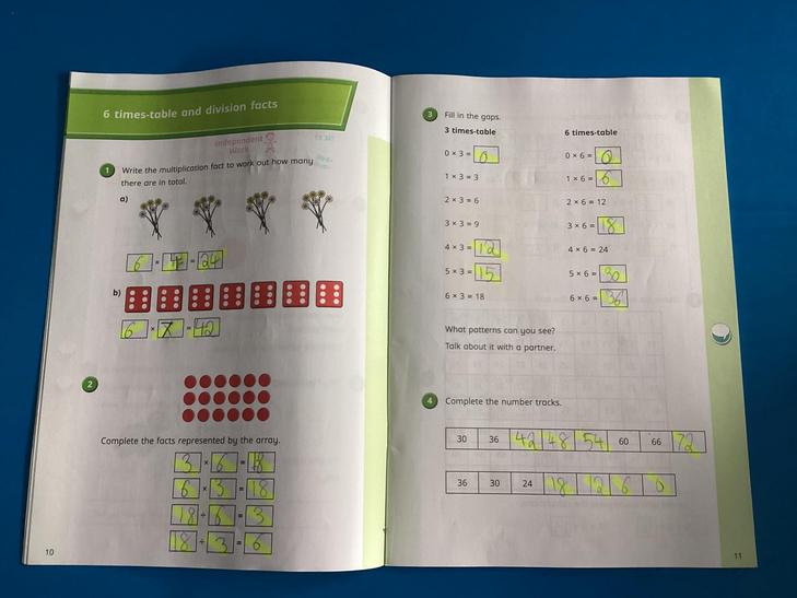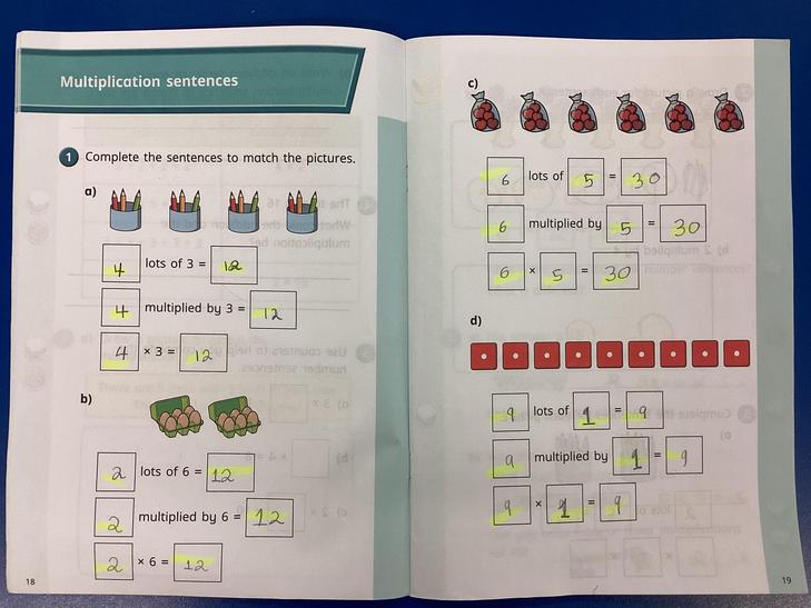 Calculate mathematical statements for multiplication and division within the multiplication tables and write them using the multiplication (×), division (÷) and equals (=) signs.
