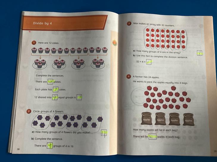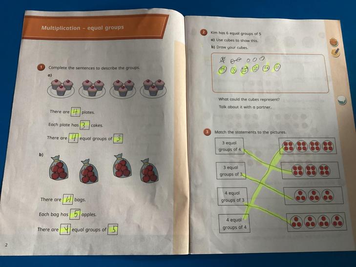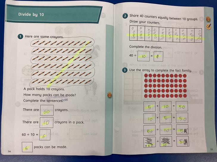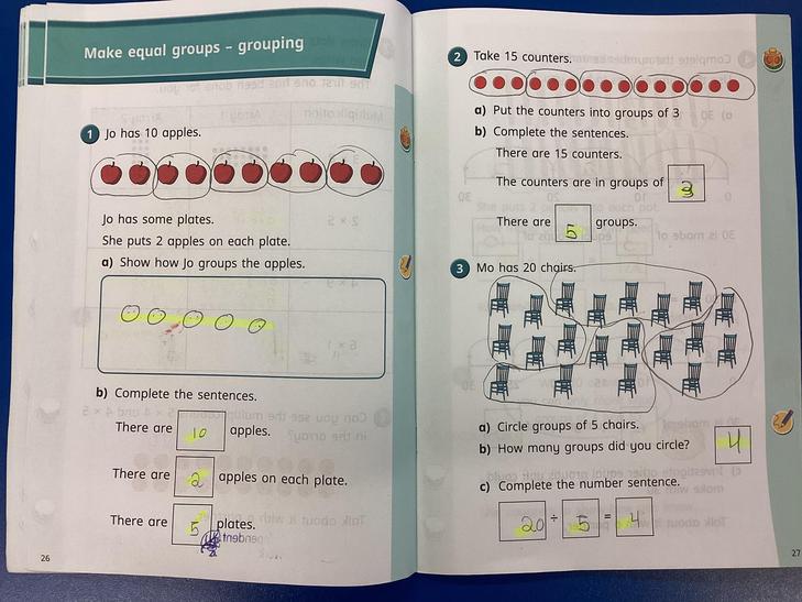 Solve one-step problems involving multiplication and division, by calculating the answer using concrete objects, pictorial representations and arrays with the support of the teacher.