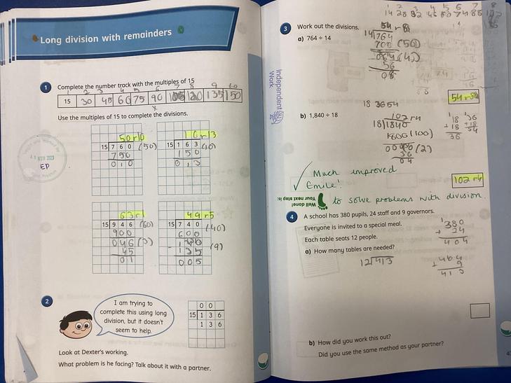 Divide numbers up to 4 digits by a two-digit whole number using the formal written method of long division, and interpret remainders as whole number remainders, fractions, or by rounding, as appropriate for the context.