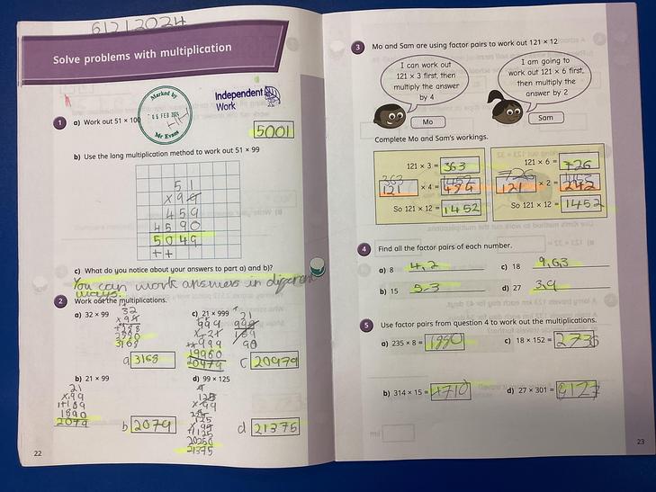 Multiply numbers up to 4 digits by a one- or two-digit number using a formal written method, including long multiplication for two-digit numbers.