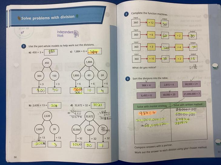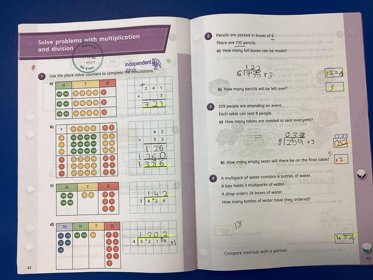 Solve problems involving multiplication and division, using materials, arrays, repeated addition, mental methods, and multiplication and division facts, including problems in contexts.