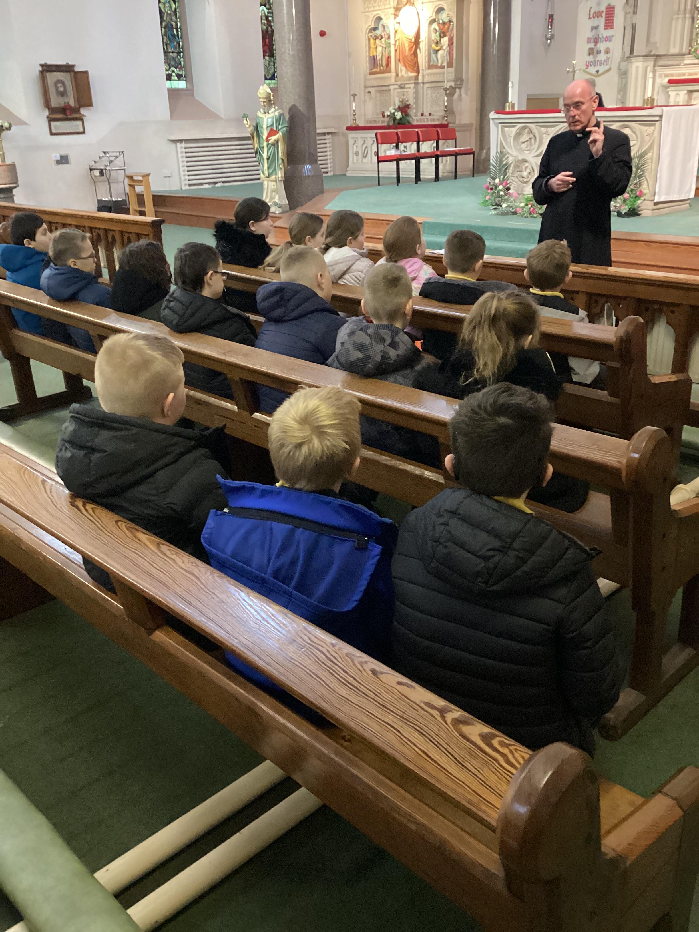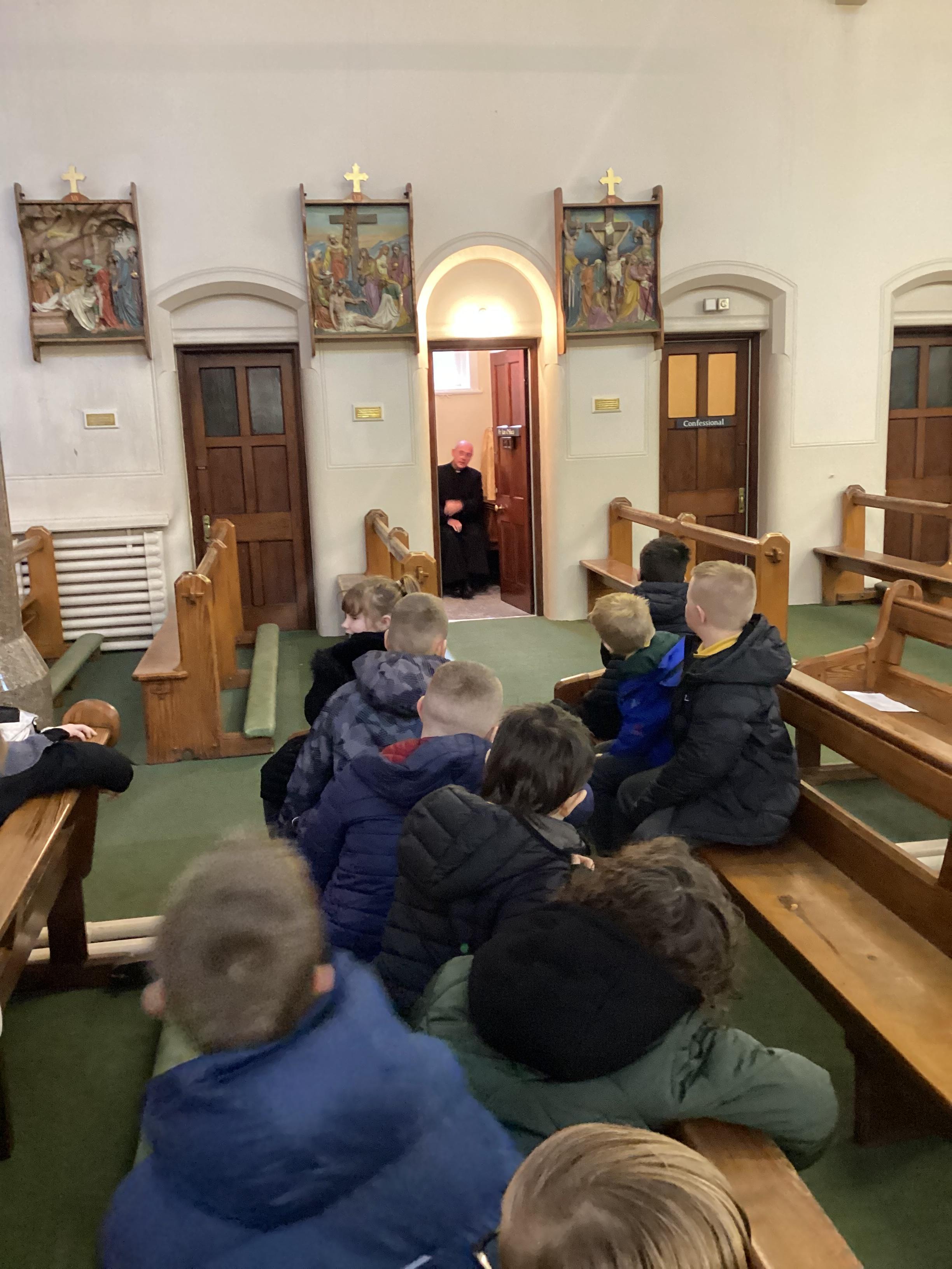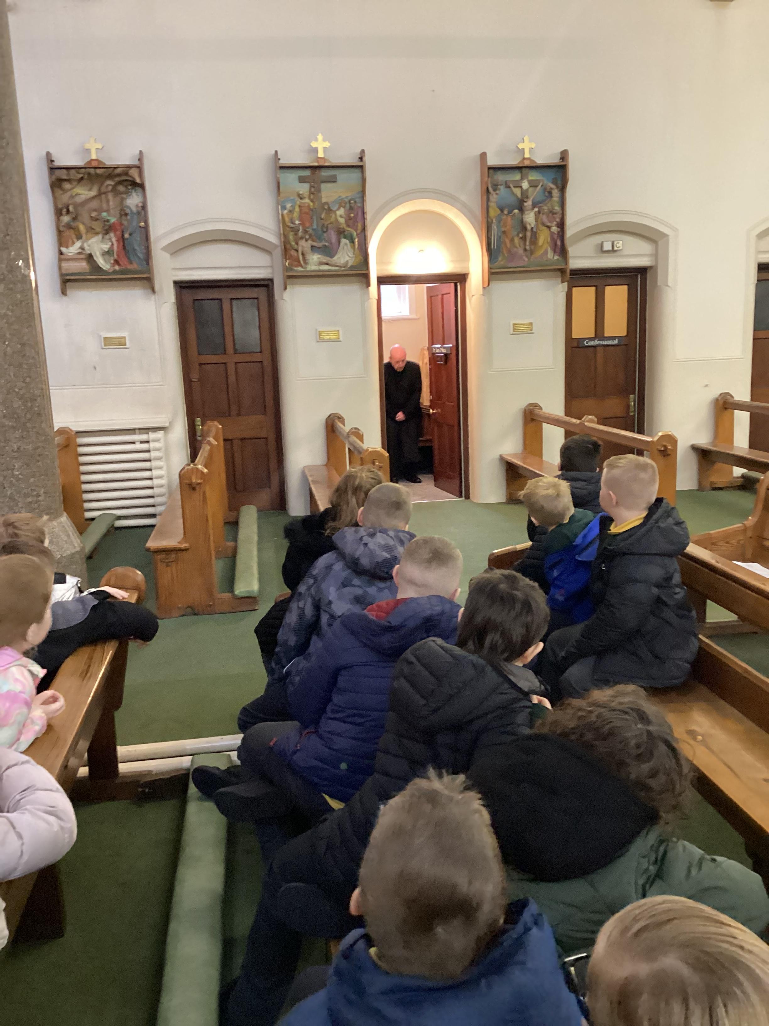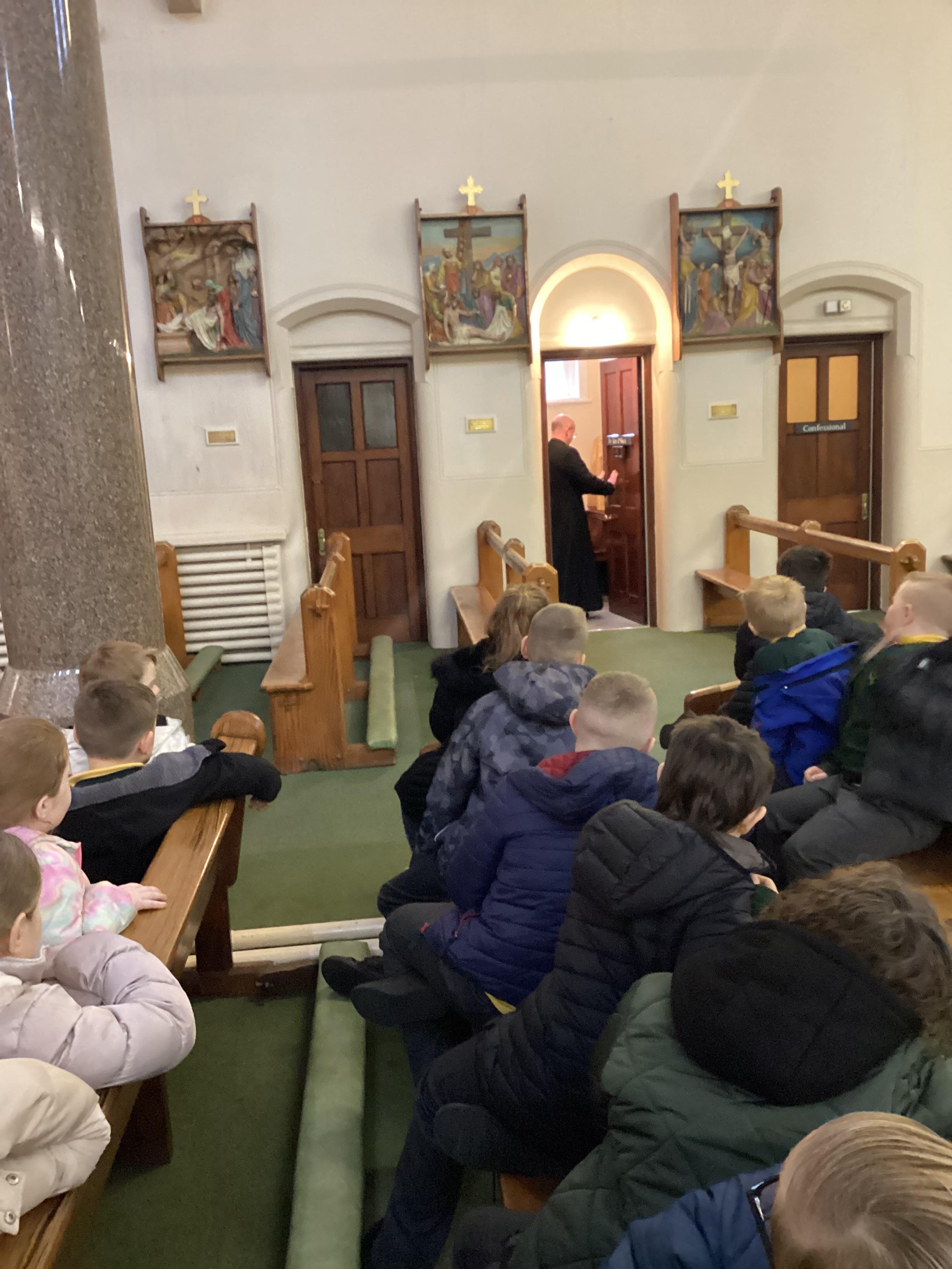 This morning, the Sacramental Preparation Group visited Father O'Shea at Church to discuss the Sacrament of Reconciliation. Father explained the importance of this Sacrament and showed the children the different parts of the Confessionals. The Group will make their Confessions over the next few weeks. Please pray for the children at this time.